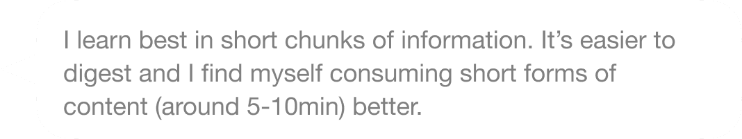 They’re also used to consuming visual and written content together, especially in learning environments. If video content is included, it should be under 10 minutes.