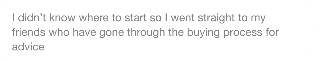 The majority of our interviewees first spoke to people in their personal networks with first hand experience in house buying, before reaching out to professionals for their experience and services.