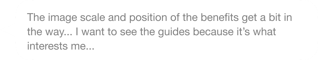 On our homepage, users noted that the sizing and placement of the 'Key Benefits' section created unnecessary scrolling before the Guides Carousel (i.e. where the true value is). They were also confused about the underlining of "free" and "simple", as it was mistaken as a hyperlink and led to unintended clicks.