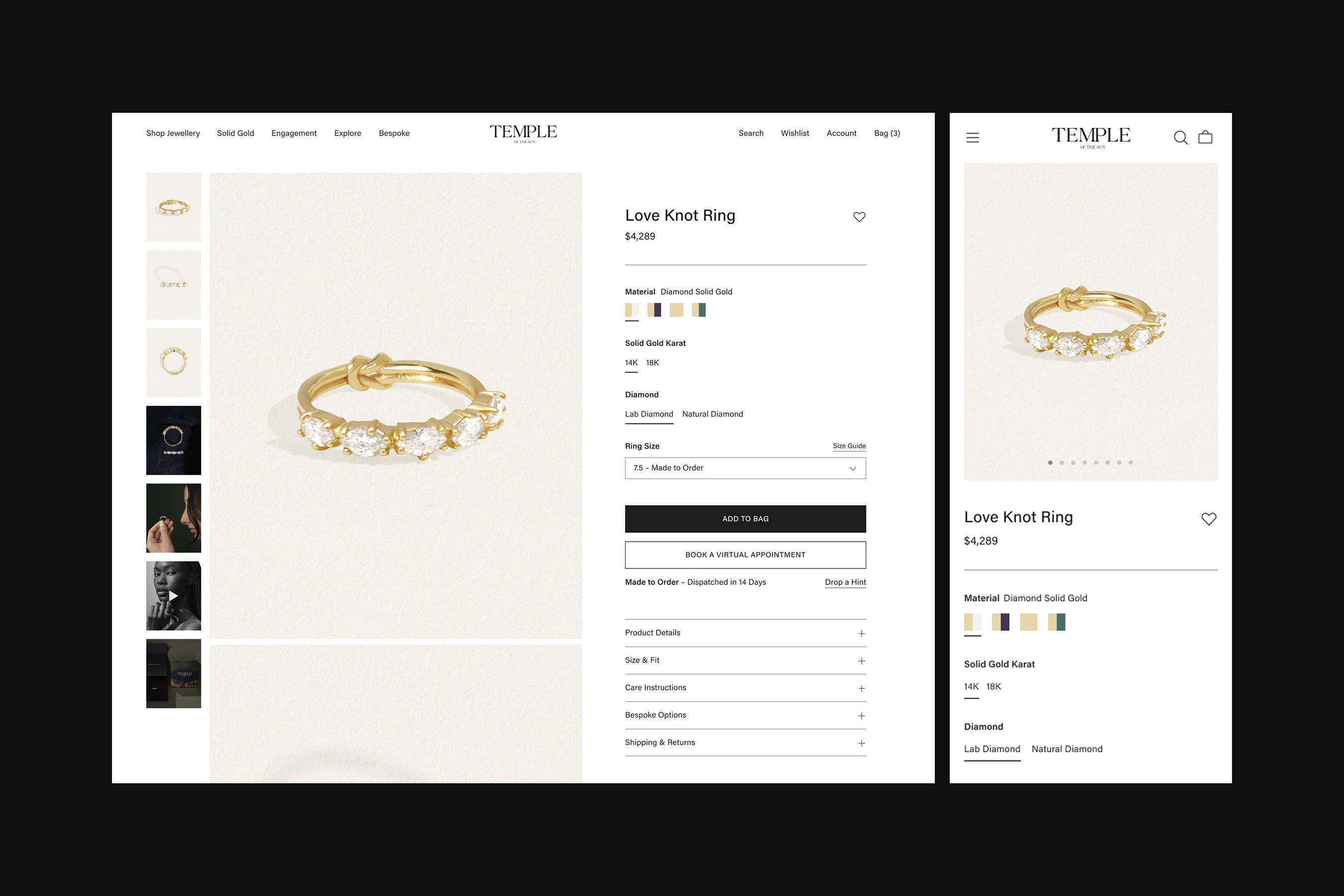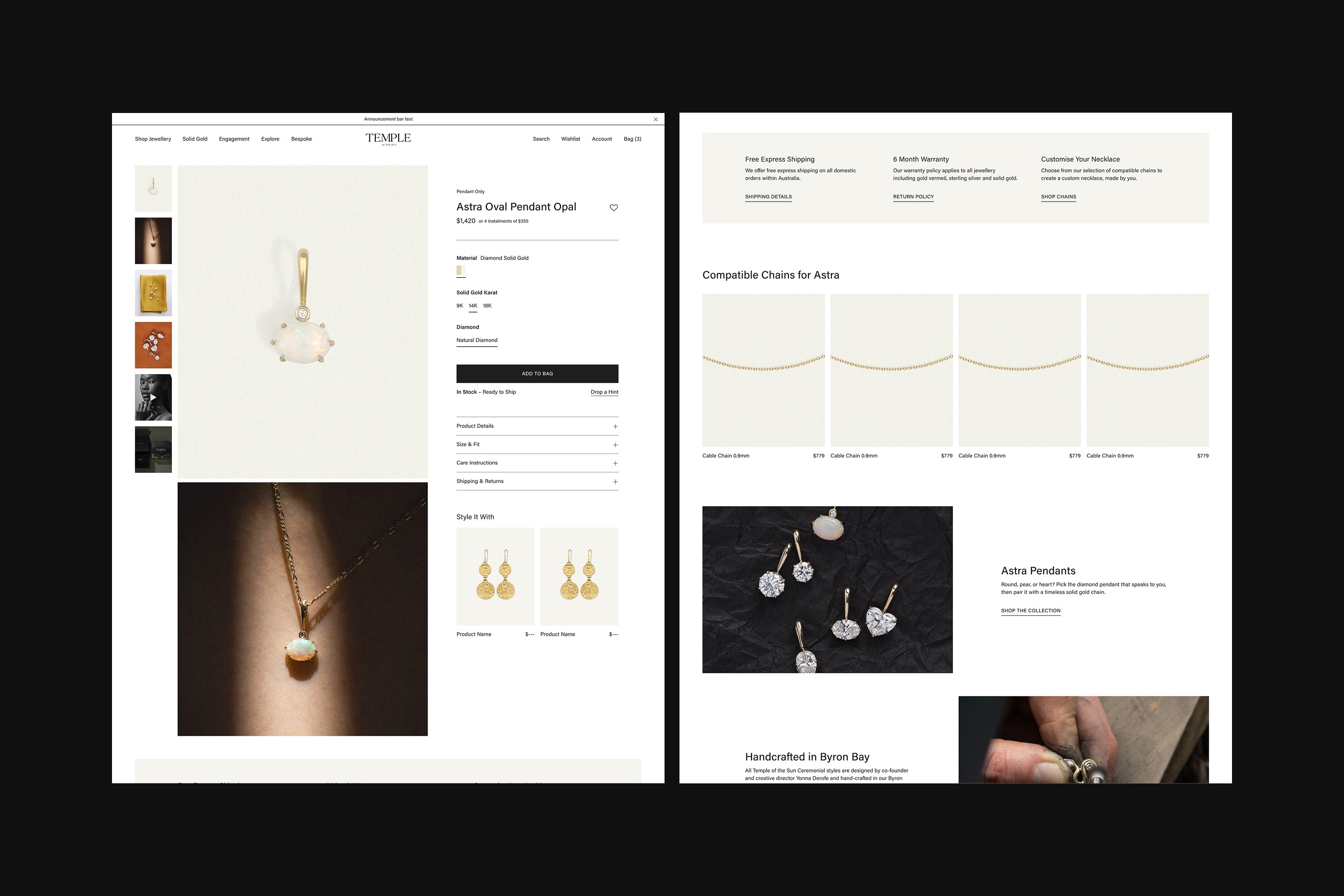 As Temple of the Sun's jewellery is listed at a premium price point, we wanted to ensure customers could make their purchases with confidence and ease. Aside from the usual in-depth description details and diverse range of imagery, we also included the customer care information that corresponded to the product's core collection.