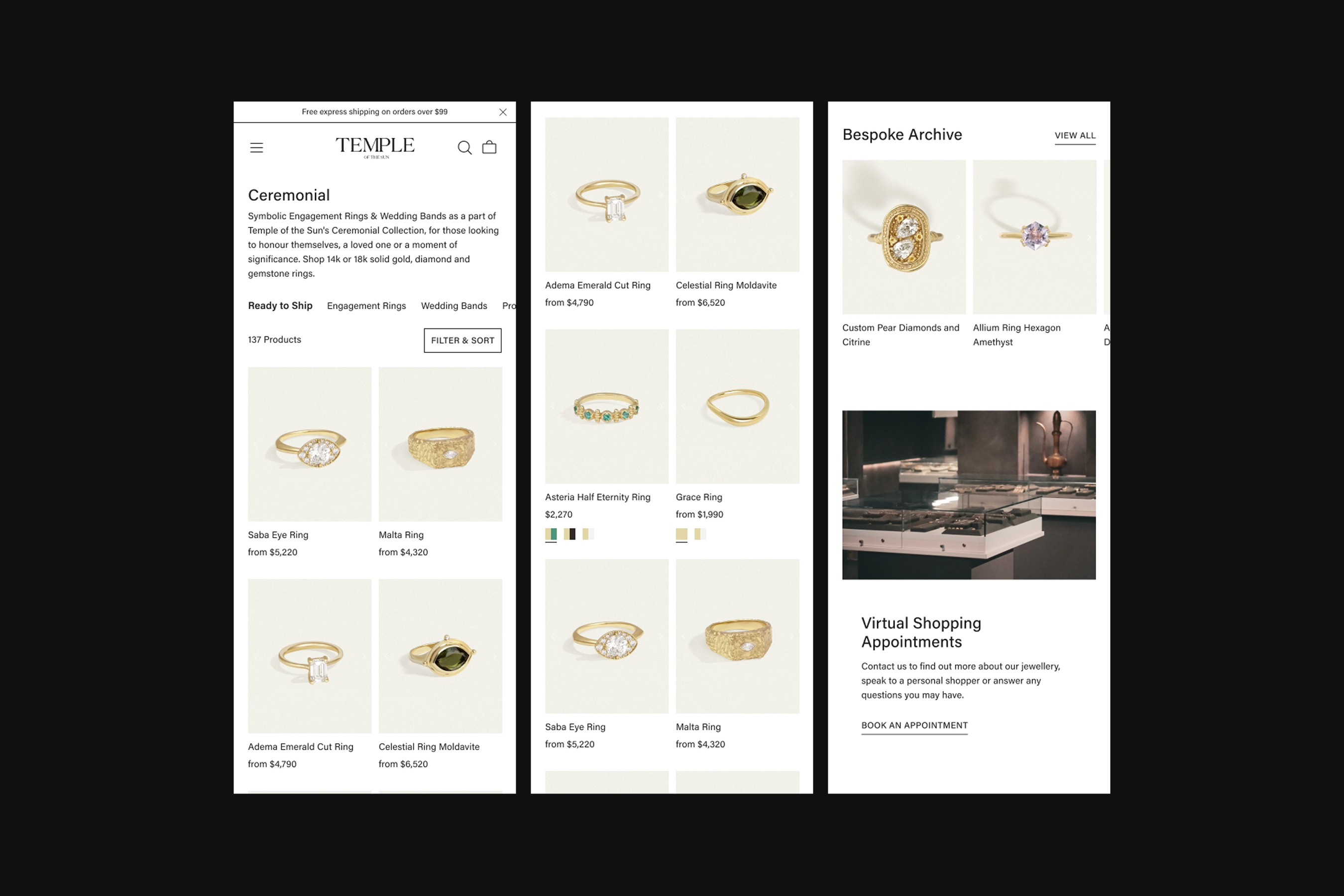 In response, I designed a series of Product Listing Page (PLP) templates with customisable content blocks and curated customer care information. This created an opportunity to further educate and engage customers with the Temple of the Sun brand – compensating for the experience they'd otherwise receive in store.
